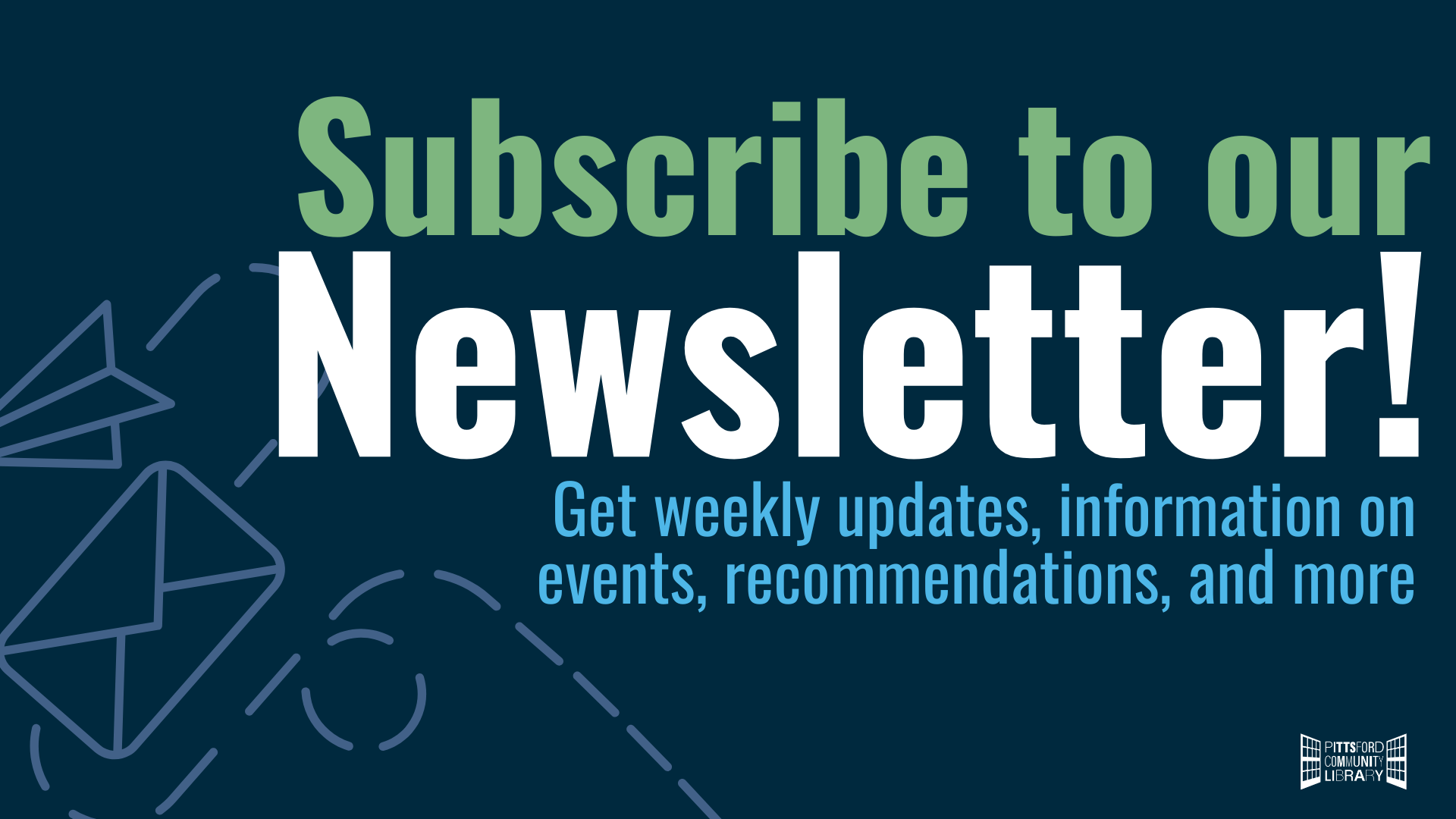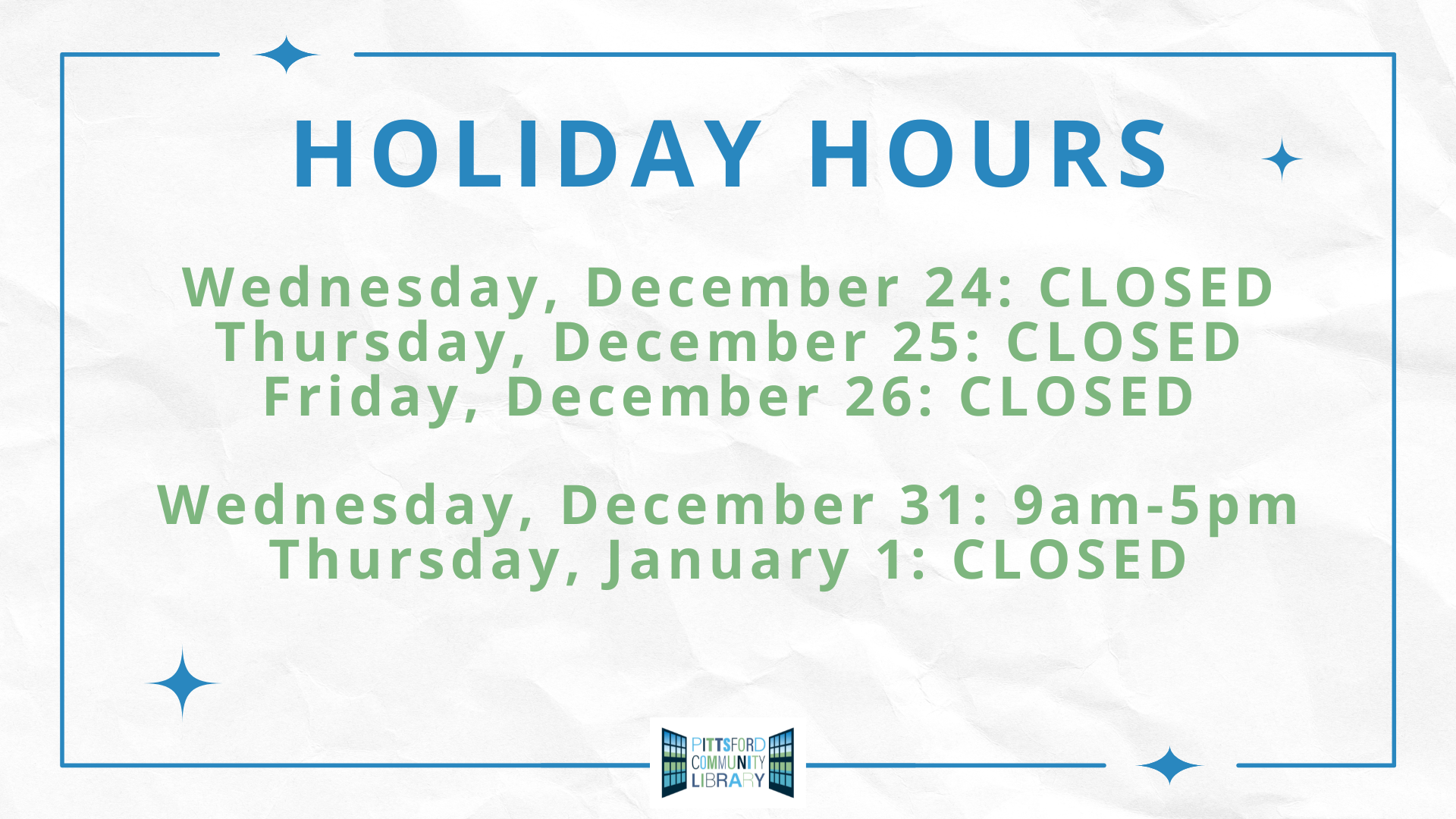 The Pittsford Community Library will be closed on Wednesday, December 24; Thursday, December 25; and Friday, December 26, reopening with normal hours on Saturday, December 27. The library will also close early on Wednesday, December 31, and remain closed on Thursday, January 1, reopening with normal hours on Friday, January 2.