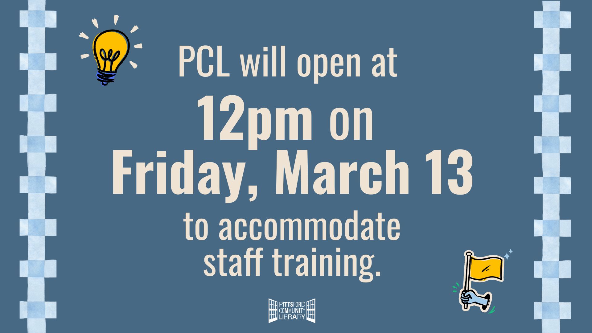 The Pittsford Community Library will open at 12pm on Friday, March 13 to accommodate staff training.