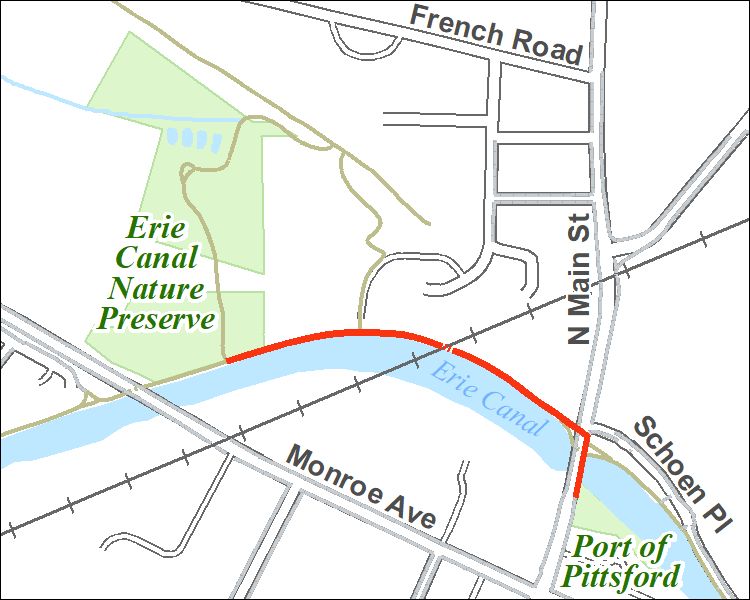 enlarge - Nature Preserve's entrance is along the Erie Canalway (Towpath) Trail - walk east from the Monroe Avenue Bridge or walk west from the North Main Street Bridge